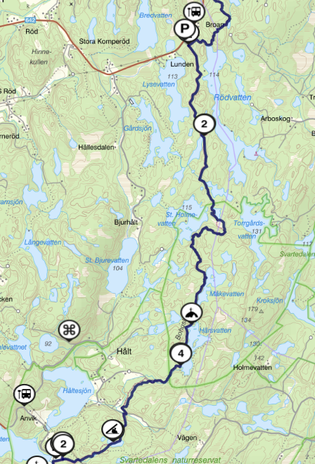 - Svårighetsgrad: röd (=svår), bitvis rejält kuperad och många nedfallna träd över stigen längs Måkevatten. Grusväg sista kilometrarna.