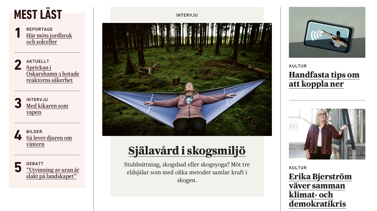 Under parollen ”Sveriges största miljö- och naturtidning – påläst och passionerad sedan 1910” levererar tidningen både aktuella och tidlösa reportage med vackra bilder om både natur och miljö. Läs själv: